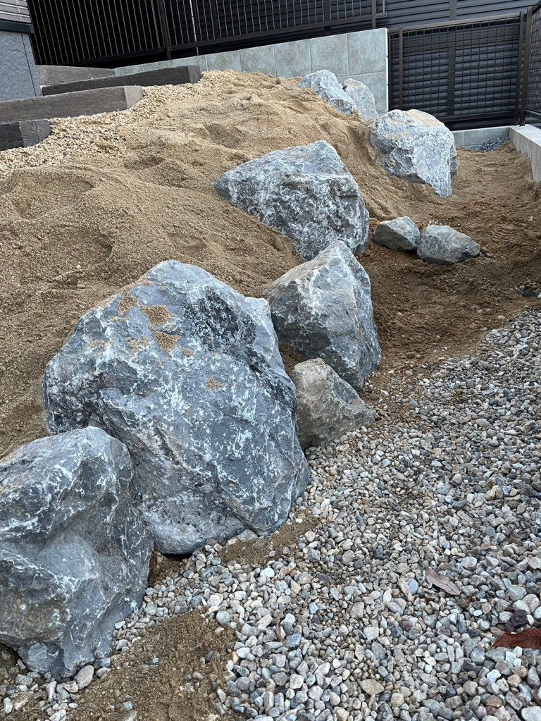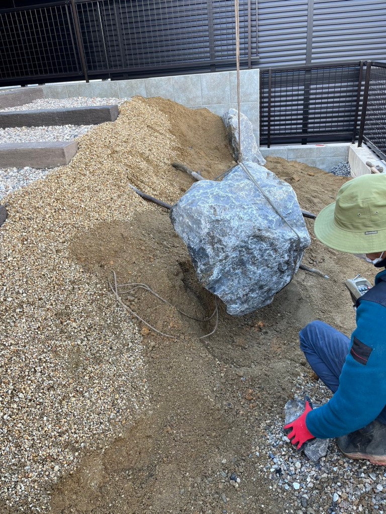 土だけですと崩れやすくなってしまうので、景石と土留めを兼ねた石を据えていきます。