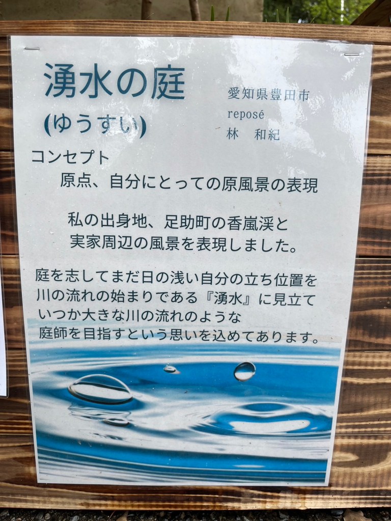 背景の土壁は香嵐渓にある香積寺を、モミジと築山、下草の笹で香嵐渓を。赤錆の橋石で待月橋を、流れは香嵐渓前の巴川を表しました。